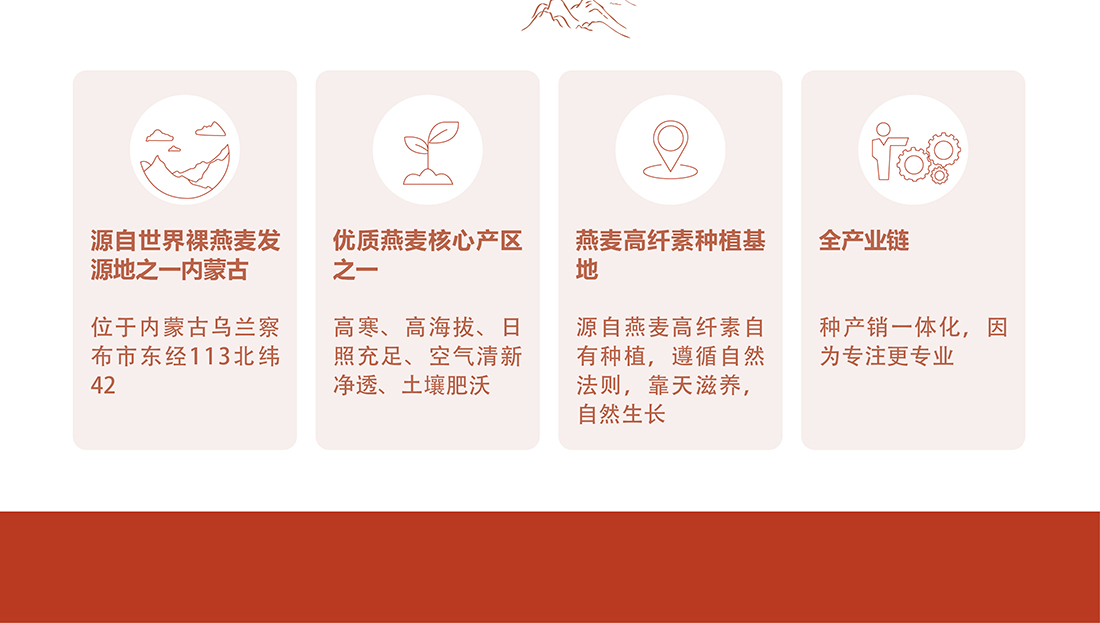 內蒙古,世界裸燕麥起源地之一;陰山源生燕麥在此初生滿足生長規律一切所需,高寒、高海拔、日照充足;遵循自然法則,靠天滋養,自然生長;